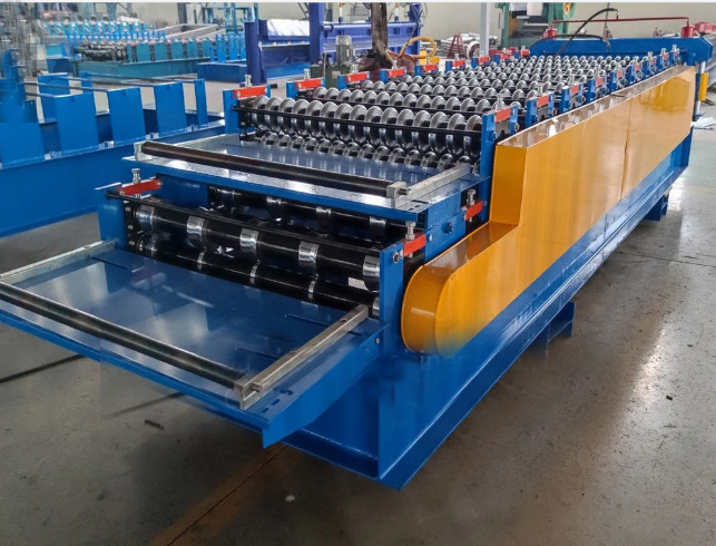 Metal Double Layer Tile Panel Roll Forming Machine Roof Sheet Making Machine is one most popular type of roll forming machines. It makes different shape of color steel roof sheet, which is used for buildings, factory, supermarket ect. For this machine, it suit coil width is 1000mm, thickness range is from 0.3mm to 0.8mm. We adopt 16mm side wall panel type to make machine frame strong. Usually it can run with the max speed to 15m/min, PLC with touch screen operation make the machine simple and easy for usage.